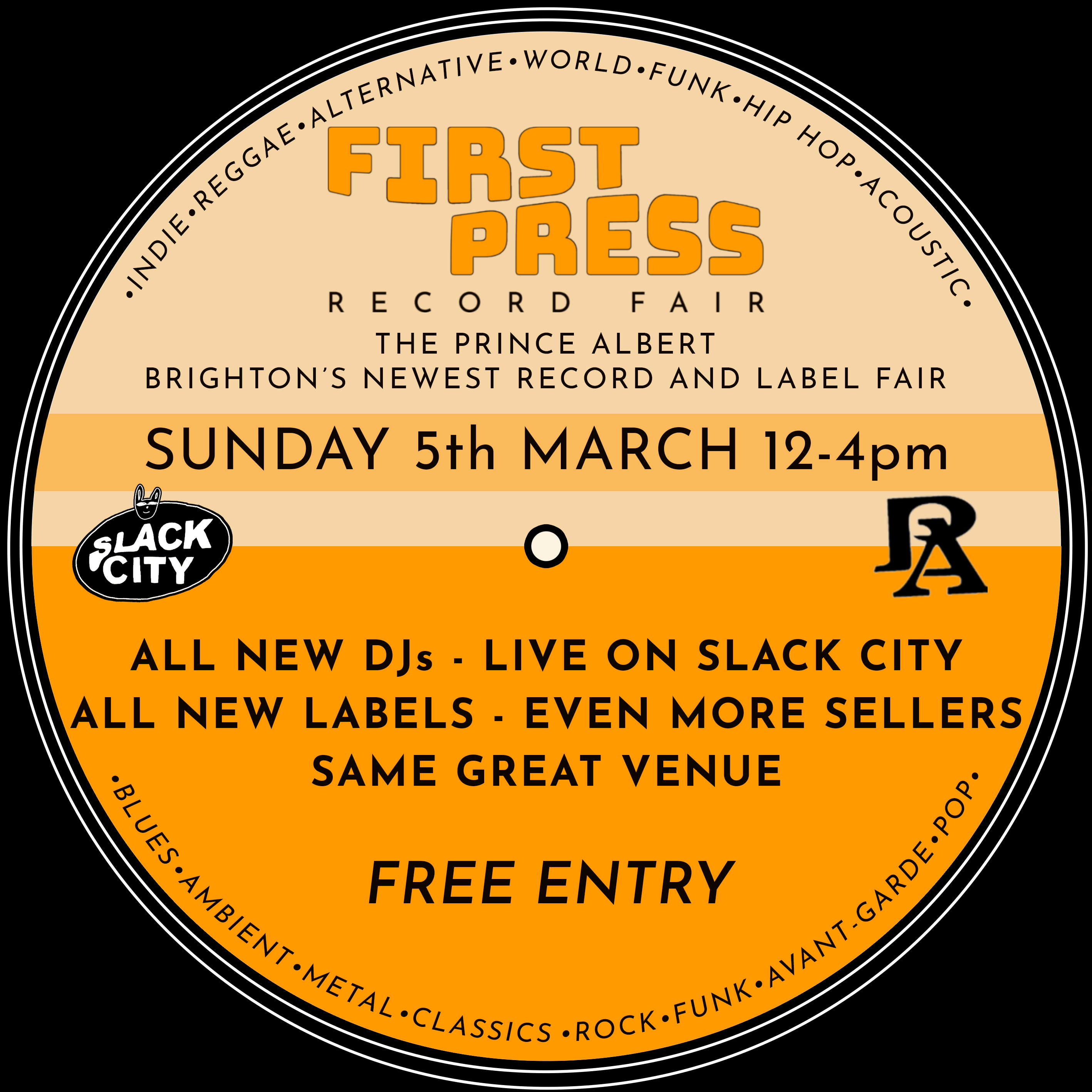 First Press Record Fair is Brighton’s newest record fair, bringing together label fresh vinyl and vintage favourites to the soundtrack of local DJs broadcast live on Brighton’s own Slack City radio.
